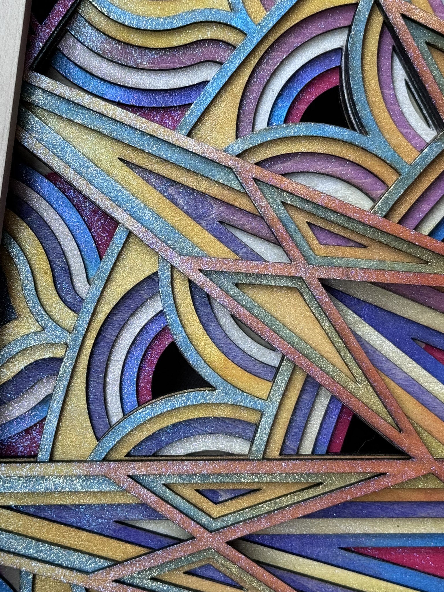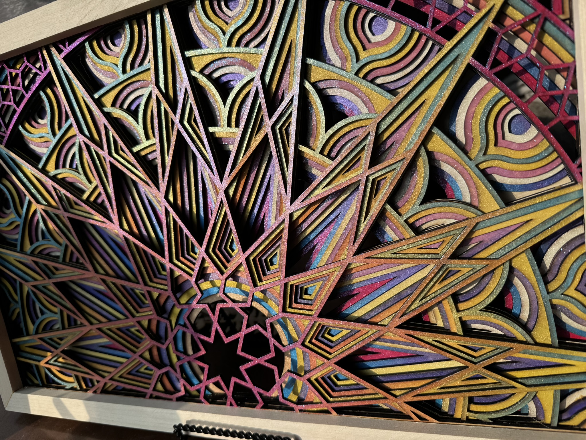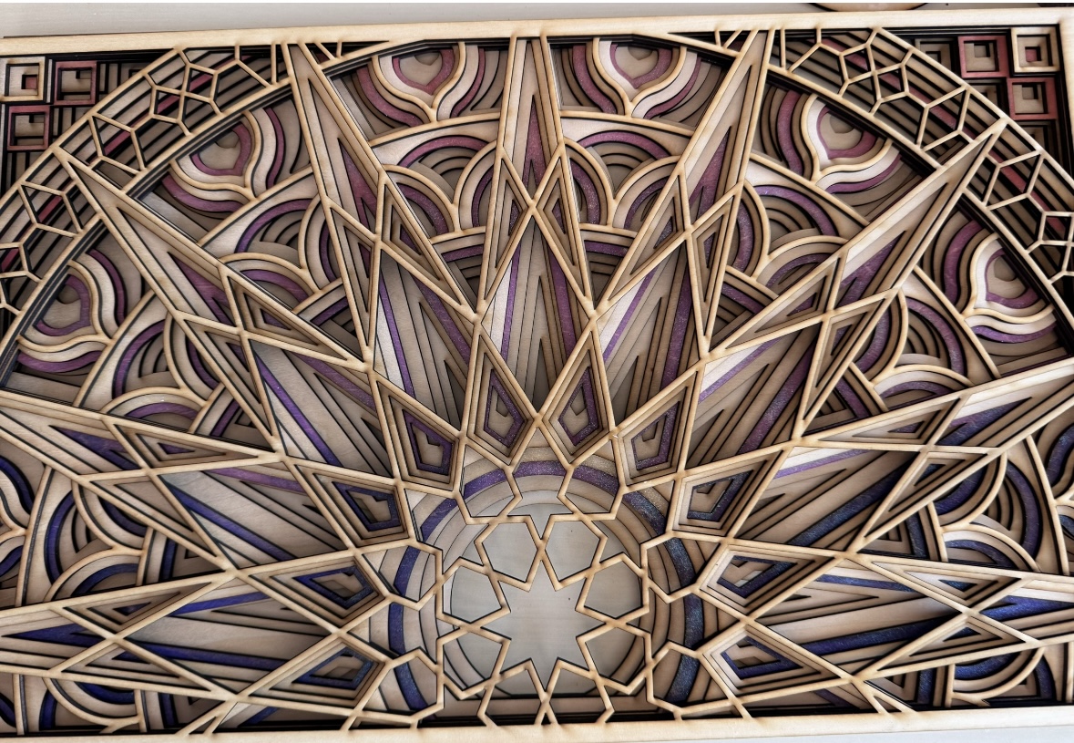 This handcrafted, seven-layer wooden mandala features vibrant, sunset-inspired colors with intricate 3D details and an iridescent, glitter-infused finish for a mesmerizing touch.