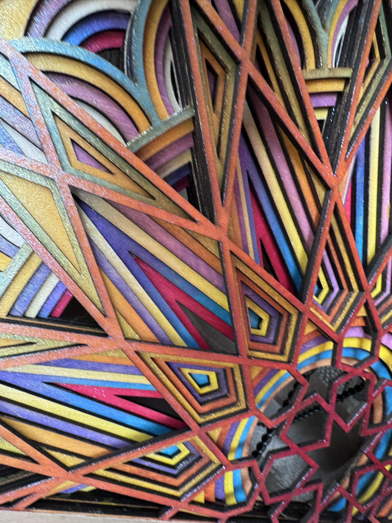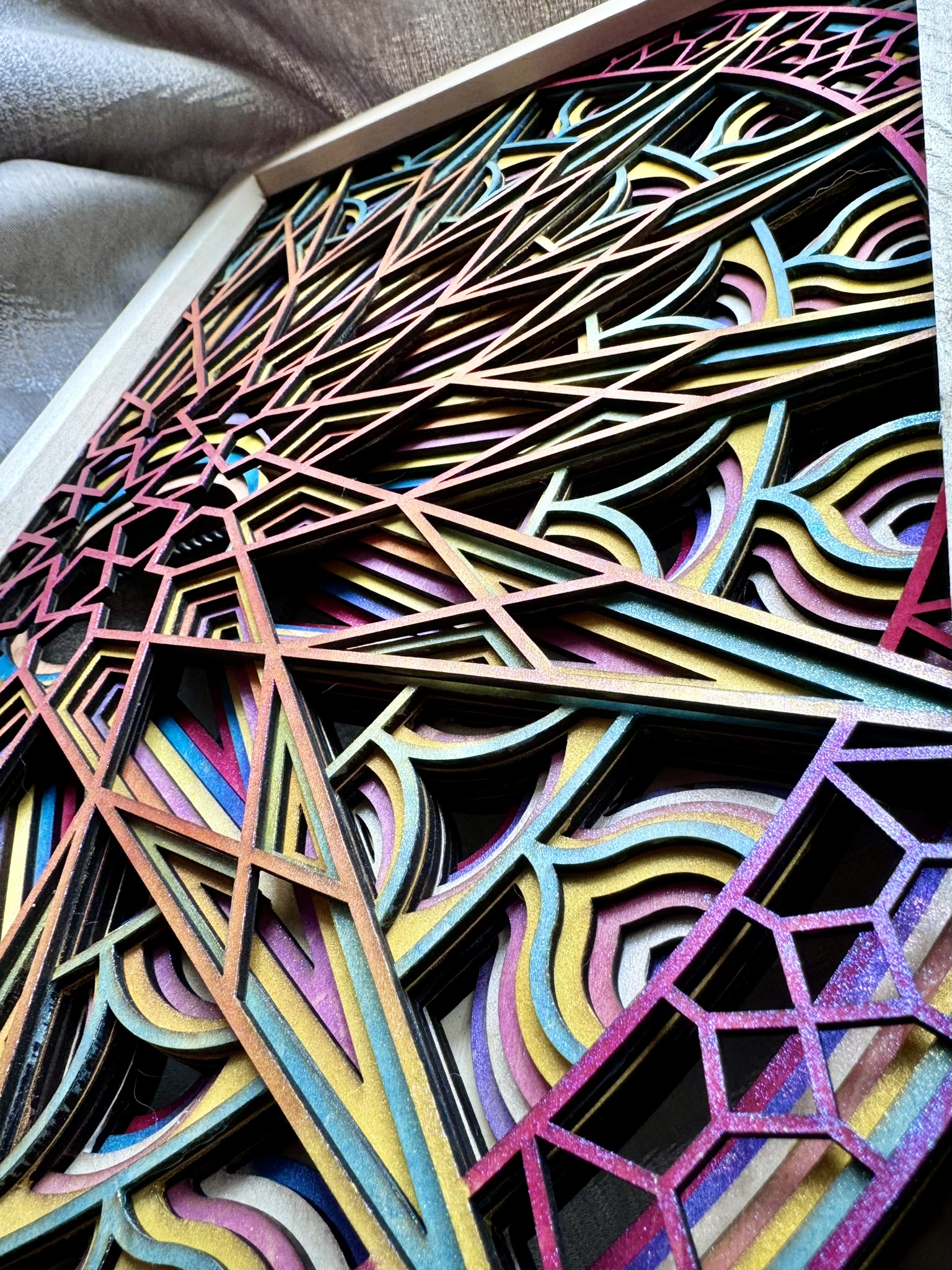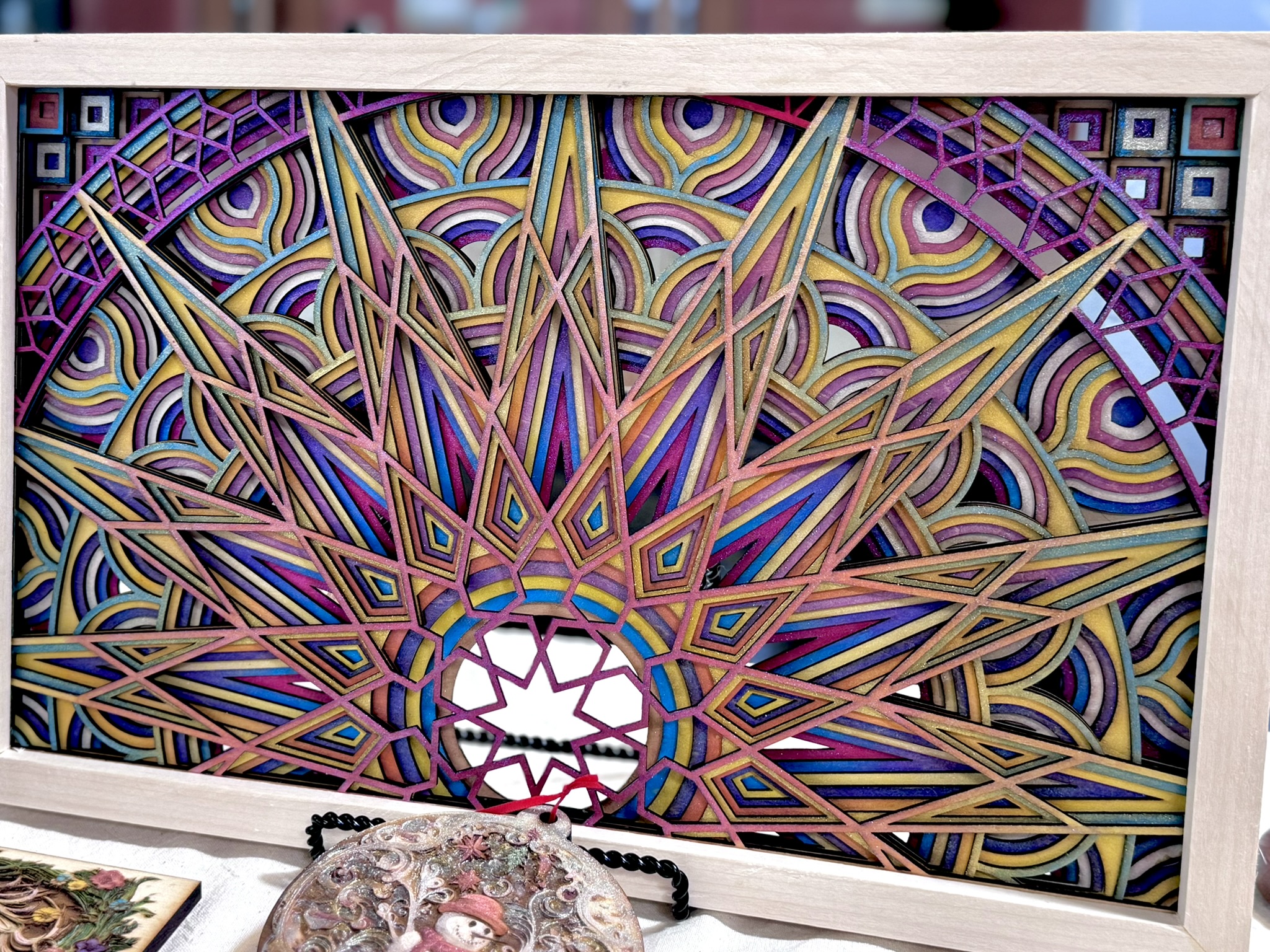 This handcrafted, seven-layer wooden mandala features vibrant, sunset-inspired colors with intricate 3D details and an iridescent, glitter-infused finish for a mesmerizing touch.